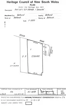 - 23/3/1984: Permanent Conservation Order over "Llanarth" gazetted for Part Lot 1 in DP 150460.[77] Heritage Office (2008B) records show that the property was subdivided by Bathurst City Council whilst the Minister was considering the PCO, therefore the PCO was gazetted for Part Lot 1 in DP 150460 instead of Lot 3 in DP 710184.