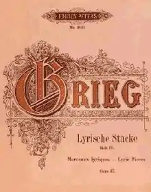 Lyric Pieces (Norwegian: Lyriske stykker) is a collection of 66 short pieces for solo piano written by Edvard Grieg. They were published in 10 volumes, from 1867 (Op. 12) to 1901 (Op. 71). The collection includes several of his best known pieces, such as Wedding Day at Troldhaugen (Bryllupsdag på Troldhaugen), To Spring (Til våren), March of the Trolls (Trolltog), and Butterfly (Sommerfugl).