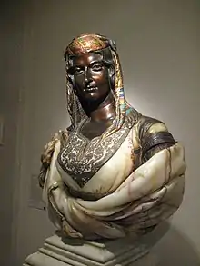 Clémentine was depicted twice more in art, in an oil painting by Constant-Joseph Brochart from about 1877 and in a pastel drawing, also by Brochart, from around 1880. In the first she is shown with her daughter Semha Lucie Stora, the third of Clémentine's four children, in an oriental fantasy scene on a terrace overlooking an imaginary city. Her husband's specialism in oriental carpets is referenced by the carpet in the picture. That painting was sold by Christie's in 2007.[7] In the second depiction, Clémentine is shown in conventional European dress for a woman of her class with no evidence of her Jewish Algerian roots. Unlike L'Algérienne, both of the Brochart portraits remained in the Stora family until after 2000.[6]