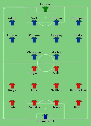 Prior to the game, Manchester United's Russian winger and season's top scorer Andrei Kanchelskis had handed in a transfer request, which was rejected by the United manager, Alex Ferguson.[15] Kanchelskis, along with Ryan Giggs, Cole and Mark Hughes, made up United's attack for the match. The pairing of Cole and Hughes up front was not considered well-matched; The Guardian's Stephen Bierley suggested that Cole was much better matched with Eric Cantona,[16] but the French forward was serving a nine-month suspension for kicking a spectator.[17] United had conceded just three league goals at Old Trafford all season.[18]