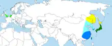 | The native range of the mandarin duck, and parts of its introduced range where it is established breeding