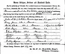 Sarah Ann and Benjamin Manson were an enslaved couple from Wilson County, Tennessee. They lived as man and wife since 1843 and had sixteen children. They were legally married on April 19, 1866, and received a marriage certificate from the Freedmen's Bureau. The certificate symbolized their right to live together as a family.[14][34]