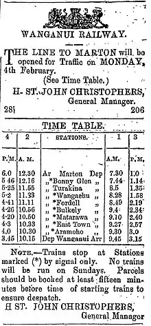 - ↑ "OPENING OF THE RAILWAY. WANGANUI HERALD". paperspast.natlib.govt.nz. 18 May 1877. Retrieved 24 January 2021.