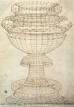 The Platonic solids and other polyhedra are a recurring theme in Western art. They are found, for instance, in a marble mosaic featuring the small stellated dodecahedron, attributed to Paolo Uccello, in the floor of the San Marco Basilica in Venice;[12] in Leonardo da Vinci's diagrams of regular polyhedra drawn as illustrations for Luca Pacioli's 1509 book The Divine Proportion;[12] as a glass rhombicuboctahedron in Jacopo de Barbari's portrait of Pacioli, painted in 1495;[12] in the truncated polyhedron (and various other mathematical objects) in Albrecht Dürer's engraving Melencolia I;[12] and in Salvador Dalí's painting The Last Supper in which Christ and his disciples are pictured inside a giant dodecahedron.[74]