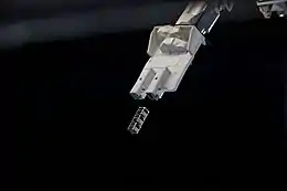 Mazaalai was sent to the International Space Station on 3 June 2017 as part of the SpaceX CRS-11 mission. The satellite was carried in a Dragon spacecraft on a Falcon 9 rocket, launched from NASA's Kennedy Space Center, LC-39A. This was the 100th launch from LC-39A and the first time SpaceX reused one of its Dragon capsules.[1] The satellite was released into orbit from the Japanese Kibō module of the ISS on 7 July 2017.[13] The satellite orbited the Earth at an altitude of approximately 400 kilometres (250 mi) and at an inclination of 51.64°, completing an orbit every 92.57 minutes at a velocity of 7.67 kilometres per second (4.77 mi/s).[14][10]