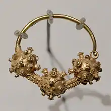 Filigree and granulation are two processes that are also closely related. They involve the decoration of a sheet of gold using the application of wires or grains of gold which can be worked into very intricate patterns.[33] These techniques allowed for intense detail and delicacy because the wires or grains could easily be worked into twisted patterns and minuscule facets.[34] All of these techniques enabled detailed work on gold jewelry, adding other materials or fine details.
