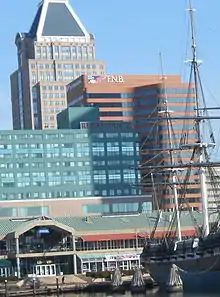 Tall red brick building with FNB—First National Bank sign was formerly the Merchants Natl. Bank Bldg. Behind is Commerce Place. In front is the USS Constellation and Harborplace Mall.