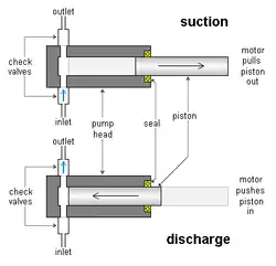 Piston-driven metering pumps commonly work as follows: There is a piston (sometimes called plunger), typically cylindrical, which can go in and out of a correspondingly shaped chamber in the pump head. The inlet and outlet lines are joined to the piston chamber. There are two check valves, often ball check valves, attached to the pump head, one at the inlet line and the other at the outlet line. The inlet valve allows flow from the inlet line to the piston chamber, but not in the reverse direction. The outlet valve allows flow from the chamber to the outlet line, but not in reverse. The motor repeatedly moves the piston into and out of the piston chamber, causing the volume of the chamber to repeatedly become smaller and larger. When the piston moves out, a vacuum is created. Low pressure in the chamber causes liquid to enter and fill the chamber through the inlet check valve, but higher pressure at the outlet causes the outlet valve to shut. Then when the piston moves in, it pressurizes the liquid in the chamber. High pressure in the chamber causes the inlet valve to shut and forces the outlet valve to open, forcing liquid out at the outlet. These alternating suction and discharge strokes are repeated over and over to meter the liquid. In the back of the chamber, there is packing around the piston or a doughnut-shaped seal with a toroid-shaped sphincter-like spring inside compressing the seal around the piston. This holds the fluid pressure when the piston slides in and out and makes the pump leak-tight. The packing or seals can wear out after prolonged use and can be replaced. The metering rate can be adjusted by varying the strokelength by which the piston moves back and forth or varying the speed of the piston motion.