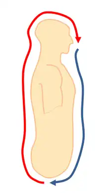 As well as the lower dantian or cauldron there are other important points along the circuit of energy flow which include the 'three gates' which are areas where it is considered that energy may stagnate, these are the wei-lu or Tailbone gate, the Dorsal gate on the back roughly level with the heart, and the Jade pillow on the back of the head.[8] Other important areas include the Ming Men or gate of fire on the back about level with the kidneys and the Baihui or Niwan which is directly on top of the head.[9]