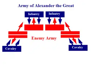 Attacking from the flanks, the Macedonian cavalry surprised the enemy troops by the speed and force of its impact; in the center, the phalanx and the hypaspists advanced to open the second front. Once the enemy's way was closed, it was left in a trap. Generally, this caused great confusion because it could not be distinguished whether the units were dispersed or just poorly coordinated.