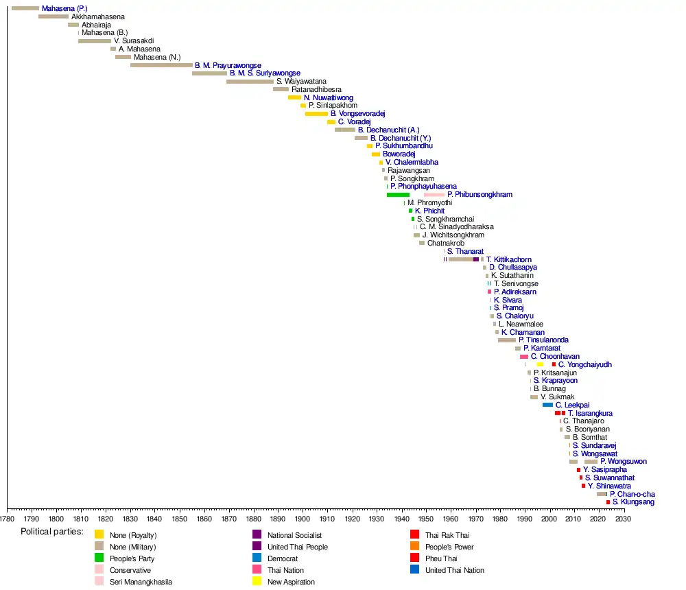 Sutin KlungsangPrayut Chan-o-chaYingluck ShinawatraSukampol SuwannathatYuthasak SasipraphaPrawit WongsuwonSomchai WongsawatSamak SundaravejThammarak Isarangkura na AyudhayaChuan LeekpaiSuchinda KraprayoonChavalit YongchaiyudhChatichai ChoonhavanPanieng KarntaratPrem TinsulanondaKriangsak ChamananSangad ChaloryuSeni PramojPramarn AdireksarnDawee ChullasapyaThanom KittikachornSarit ThanaratPhichit KriangsakphichitPlaek PhibunsongkhramPhraya PhahonphonphayuhasenaVudhijaya ChalermlabhaBoworadetParibatra SukhumbandhuChaophraya Bodindechanuchit (Yaem na Nakhon)Chaophraya Bodindechanuchit (Arun Chatrakul)Chirapravati VoradejBhanurangsi SavangwongseNarisara NuwattiwongSomdet Chaophraya Borom Maha Sri SuriwongsePrayurawongseChaophraya Mahasena (Pli)