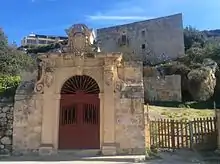 The Mistra Gate is built in the Baroque style, and it is decorated with the coats of arms of Grand Master Manuel Pinto da Fonseca, the Monte di Redenzione, Balì Claudius de Montagne de Lafeuliere and Balì Carlo Maria Olgiati.[3][2] A farmhouse which was also part of the estate is located close to the gate. In addition, a marker indicating the limits of the property belonging to the Monte di Redenzione can also be found nearby.[4]