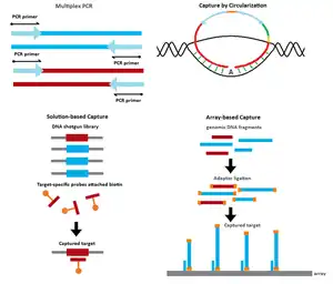 Gene selector method:[15] An initial multiplex PCR step is performed to enrich the targets of interest. The PCR products are circularized upon hybridization to target-specific probes with sequences complementary to the two primers used in the PCR step.
