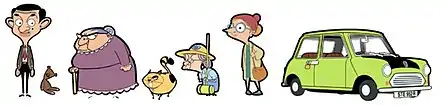 The show's characters and props. From left to right: Mr. Bean, Teddy, Mrs. Wicket, Scrapper, Miss Wince, Irma Gobb and Mr. Bean's Mini.