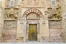Muhammad I is credited with some of the work done on the Great Mosque of Cordoba in the 9th century. He may have completed the first major expansion of the mosque begun by his father, Abd ar-Rahman II.[6][7] He also added a maqsura.[6] In 855 he restored the entrance called Bab al-Wuzara' ("Gate of the Viziers"), known today as the Puerta de San Esteban, which is an important early example of the prototypical Moorish gateway.[8][6][7]