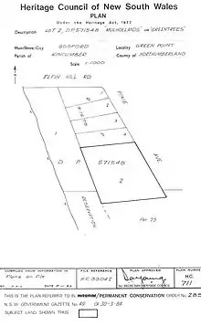 The estate, surveyed and laid out by Dawson and Stephen, licensed surveyors, of 139 Pitt Street, Sydney, offered a range of allotments varying in size from 2 to 32 acres. All allotments had access to a reserved road of 100' width. A government wharf reserve was also established (adjacent Lot 6 of the estate) together with associated road access (now known as Lexington Parade). The reservation of all land within 100' of the high-water mark of Brisbane Water (probably established at the issue of the original Crown grants), was retained by the Crown.[1]