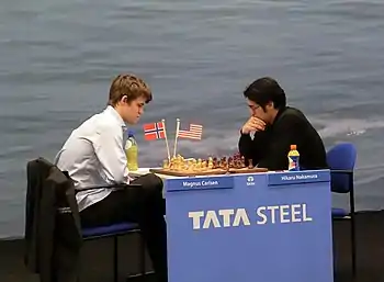 From January 14 through 30, Nakamura competed in the Tata Steel Grandmaster A tournament in Wijk aan Zee among a field of world No. 1 and defending champion Magnus Carlsen, world champion and world No. 2 Viswanathan Anand, world No. 3 and reigning World Blitz champion Levon Aronian, world No. 4 and former world champion Vladimir Kramnik, world No. 7 Alexander Grischuk, former FIDE world champion Ruslan Ponomariov, reigning Russian champion Ian Nepomniachtchi, reigning Chinese champion Wang Hao, Maxime Vachier-Lagrave, Alexei Shirov, Anish Giri, Jan Smeets, and Erwin L'Ami. The average rating of the field was 2740, making this thirteen-round event a category 20 tournament. After twelve rounds, Nakamura was in clear first place with 8½ points going into the final round, half a point ahead of Anand and a full point ahead of Carlsen and Aronian.[44][45] In the final round, Nakamura drew against Wang with the black pieces in a King's Indian Defense. With the draw, Nakamura finished with 9/13 (+5), a tournament performance rating of 2879, and guaranteed at least a share of first place. With Anand's final round draw against Nepomniachtchi, Nakamura clinched sole possession of first place,[46] making him the first American to win the Wijk aan Zee tournament since 1980. The win also guaranteed that Nakamura would join Carlsen (winner of the 2010 Pearl Spring chess tournament) as qualifiers for Grand Slam Masters Final 2011 in September 2011.[47] Nakamura after the tournament stated that his goal was to reach a 2800 rating by the end of the year; the win raised his rating from 2751 to 2774 and from world No. 10 to world No. 7 on the unofficial live rating list.[48]