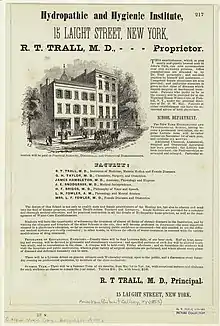 At the same address on Laight Street, Trall also operated The Hygienic Institute.[2] In the 1860s E. P. Miller was its proprietor and resident physician, whilst Trall remained consulting physician. Its female physician was Ellen Goodell Smith.[11] In 1864, it was reported that the institute had treated more than 10,000 patients.[11]
