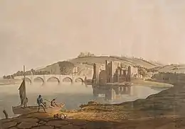 Bronze Age fishermen settled around the fertile estuary of the River Usk and later the Celtic Silures built hillforts overlooking it.[22] In AD 75, on the very edge of their empire, the Roman legions built a Roman fort at Caerleon to defend the river crossing. According to legend, in the late 5th century Saint Gwynllyw (Woolos), the patron saint of Newport and King of Gwynllwg founded the church which would become Newport Cathedral. The church was certainly in existence by the 9th century and today has become the seat of the Bishop of Monmouth. In 1049/50, a fleet of Orkney Vikings, under Welsh king Gruffydd ap Llywelyn, sailed up the Usk and sacked St Gwynllyw's church.[23][24] The church suffered a similar fate in 1063, when Harold Godwinson attacked south Wales.[25][26] The Normans arrived from around 1088–1093 to build the first Newport Castle and river crossing downstream from Caerleon and the first Norman Lord of Newport was Robert Fitzhamon.