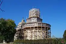 The structure is trefoil in shape, built of stone and brick. The spire resembles those of early Moldavian churches. In 1814, the archimandrite of the day restored the church, adding a closed foyer with a door and four windows, on top of which a bell tower was built.[1] There are four bells, one of which was cast at Brașov in 1790.[2] The exterior decoration is sparse, confined to niches and buttresses. The nave has an arched ceiling with an octagonal gap for the spire, while the altar space is a quarter-sphere.[1] In 1926, part of the parish house was rebuilt and the interior painted;[2] the church suffered damage during the 1940 Vrancea earthquake. During the subsequent repairs, the upper part of the walls was whitewashed; the painting was not of high quality, as can be discerned from what remains. By contrast, the 19th-century iconostasis is beautifully carved and features five rows of well-crafted icons. Other valuable objects in the church include two Gospel books, one decorated in silver, another in silvered velvet; the royal doors; the stand for the Virgin Mary's icon; icons of Ss. Barbara and Charalambos; old liturgical books finely typed. To the south of the church, there is a building that once served as the archimandrite's residence,[1] dating to 1858;[2] later a primary school, it is now a kindergarten.[1] No old inscriptions survive, only one in Greek above the entrance recording the 1814 expansion.[2]
