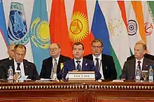 Dmitry Medvedev with Sergei Lavrov and Patrushev at the 2010 SCO Summit in Tashkent, Uzbekistan