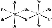 Niobium(V) bromide is the inorganic compound with the formula Nb2Br10. Its name comes from the compound's empirical formula, NbBr5.[2] It is a diamagnetic, orange solid that hydrolyses readily. The compound adopts an edge-shared bioctahedral structure, which means that two NbBr5 units are joined by a pair of bromide bridges. There is no bond between the Nb centres.[3] Niobium(V) chloride, niobium(V) iodide, tantalum(V) chloride, tantalum(V) bromide, and tantalum(V) iodide all share this structural motif.