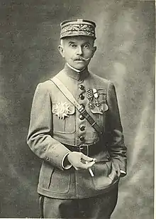 Garnier-Duplessix took over command of the 2nd Infantry Division from General Deligny on 8 September 1914.[5] This was whilst the division was engaged in the important First Battle of the Marne that thwarted the German Schlieffen Plan objective of quickly capturing Paris.[5] Garnier-Duplessix was subsequently posted to the French protectorate of Morocco where he came under the command of General Hubert Lyautey. In Morocco he was placed in command of a groupe mobile, a mobile combined arms force, based at Sidi Lamine and participated in the Zaian War against the Berbers of the Middle Atlas.[6] After the French defeat at the Battle of El Herri left Khénifra threatened with capture, Garnier-Duplessix led his groupe mobile 30 miles (48 km) through continuous Berber ambushes to relieve the strategically important town within three days.[6] He was appointed an officer of the Legion of Honour on 3 December 1914.[7]
