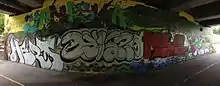 Two years later, the sequel to the Art-Yamaska project happened under Patrick-Hackett bridge, located a bit lower on the North Yamaska, in downtown Granby; this time youth citizens partake in a series of eight workshops given at Centre culturel France-Arbour (France-Arbour cultural center) at Atelier 19, these were on the subject of graffiti art and aimed at the development of a mural with a themed message: environment and habits that are respectful of nature. The bridge's underside is often vandalized, a portion of the illegal art has been kept, while the top and sides were transformed into a unique representation of the Yamaska river. The official title of the mural "Qu'es-tu devenu, Yamaska?" (Yamaska, what have you become?) is hand-painted with a style reminiscing graffiti; it was created by over thirty volunteers of all age groups; the concept of the message comes from a group of youth from the region that have environment at heart.[10]