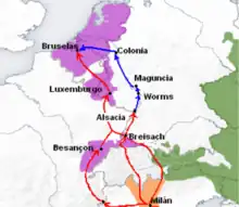 Philip III was willing to accept Ferdinand II as successor of Matthias if certain conditions were met.[3] Philip's greater priority was the Eighty Years' War and his desire to secure the so-called Spanish Road, a land route connecting the Spanish possessions in northern Italy with the Spanish Netherlands.[3][7] The sea route to the Spanish Netherlands was insecure, since much of the Spanish Armada had been lost and the Scheldt river was blocked by the Dutch Republic.[7] While these setbacks had caused Philip to agree to a suspension of hostilities in Europe (the Twelve Years' Truce), the Eighty Years' War was still raging in the colonies and Philip intended to resume hostilities in the European theatre rather than accept the peace conditions proposed by the Dutch Republic.[7] Philip also wanted to strengthen his position in Italy by acquiring principalities around its Duchy of Milan and by gaining direct access to the Mediterranean Sea via towns like Finale Ligure, allowing it to bypass the Republic of Genoa.[8]