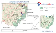 Ohio's 6th congressional district is represented by Representative Bill Johnson (R-OH). This district runs along the eastern side of the state, bordering West Virginia, and Pennsylvania. It stretches from Marietta through several Ohio River industrial towns all the way to the city of Youngstown.[4]
