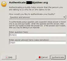 - ↑ Chris Alexander; Ian Avrum Goldberg (February 2007). "Improved user authentication in off-the-record messaging". Proceedings of the 2007 ACM workshop on Privacy in electronic society (PDF). New York: Association for Computing Machinery. pp. 41–47. doi:10.1145/1314333.1314340. ISBN 9781595938831. S2CID 17052562.