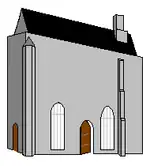 Left: Old Shute House, view of northern facade of the original Great Hall of 1380. The original entrance door remains in the centre of the building, flanked on either side by a now partially blocked-up 12 ft pointed arched gothic window. All the windows now existing were later additions as the two floors were added successively. The small low roofed building to the west (right) is an addition c. 1475, variously termed the "Oratory" (Bridie), "Steward's Room" (Pole-Carew[4]) or "Entrance Block" (Pevsner). The holes in the stonework above the door are either "putlog holes (Bridie) or "pigeon holes" (Pole-Carew[5]); right: Reconstruction of appearance from same viewpoint of the newly built manor house in 1380