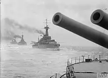 Once Jellicoe's ships had rendezvoused with the 2nd BS, coming from Cromarty, Scotland, on the morning of 31 May, he organised the main body of the Grand Fleet in parallel columns of divisions of four dreadnoughts each. The two divisions of the 2nd BS were on his left (east), the 4th BS was in the centre and the 1st BS on the right. When Jellicoe ordered the Grand Fleet to deploy to the left and form line astern in anticipation of encountering the High Seas Fleet, this naturally placed the 2nd BS at the head of the line of battle.[30] In the early stage of the battle, Conqueror and Thunderer fired at the crippled light cruiser SMS Wiesbaden with unknown results. The two ships also engaged German dreadnoughts, but failed to make any hits. Monarch and Orion, in contrast, did not fire at Wiesbaden, but shot at and hit several German dreadnoughts. Between them, the pair hit the battleships SMS König and SMS Markgraf once each, lightly damaging them, and the battlecruiser SMS Lützow five times, significantly damaging her. The sisters were not heavily engaged during the battle, with none of them firing more than 57 rounds from their main guns.[31]