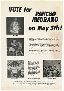 Medrano was introduced to union work when organizers distributed literature at the plant gates. He worked with organizers to create a union at the plant and lost his job for doing so. The Local 645 of the United Auto Workers-Congress of Industrial Organizations (UAW-CIO) was formed in 1943, and Medrano was reinstated at his job.[8] He was later elected Sergeant at Arms for Local 645 (which became Local 848 in 1962),[12] and in 1955 was elected as a trustee. Medrano left his job to become a full-time UAW official in 1963.[8]