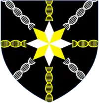 Sable a Mullet of eight points gyronny Or and Argent between four strands of DNA issuing in saltire Argent and four strands of DNA issuing in cross Or