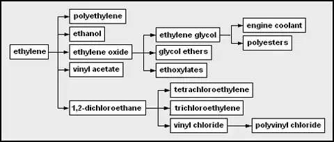 - ethanol – via ethylene hydration (chemical reaction adding water) of ethylene