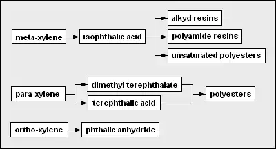 - ortho-xylene – both methyl groups can be oxidized to form (ortho-)phthalic acid