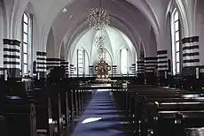 The altarpiece is a painting in a gilt carved frame by Danish artist Erik Jensen (1883-1974). The pulpit has gospel reliefs by M. Sørensen. Above the west entrance is a tympanon relief designed by Johan Rudolf Carl Nielsen (1863-1952). The inscription quoting the words of Philip the Apostle to Nathanael in John 1:45: "Come and see".[2] [3]