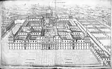 In 1584 Juan de Herrera commissioned Perret to print images of the plants and topographical views of the Monastery of San Lorenzo Del Escorial.[5]:160 Herrera was to provide the copper plates already drawn by his hand, and Perret was to engrave them for a fee of 600 ducats. Perret moved to Madrid and was bound to take on no other work until the plates were engraved.[6]:142-143 However, the work was not completed until 1589. That year, they were collected in a small book titled Sumaria y breve declaración de los diseños y estampas de la fábrica de San Lorenzo del Escorial and sold by Herrera. Despite the prohibition on taking on other work, Perret published the first of his portraits, that of the Empress Maria of Austria, in 1585.[2]:122