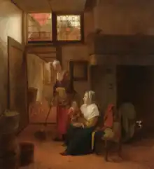 Little is known of De Hooch's living arrangements in Amsterdam, though it has been established that he had contact with Emanuel de Witte.[5] In 1670, he was living in the Konijnenstraat.[6] He lived in an area outside of the city walls but near the Westerkerk where his family attended church. Most scholars believe that de Hooch's work after around 1670 became more stylized and deteriorated in quality. It may be that his work was affected by his distress at the death of his wife in 1667 at age 38, leaving him with a young family. After 1680, de Hooch's painting style became coarser and darker in color. It is said often that he died in an asylum in 1684, but it was his son of the same name who died.[8] The date of his death is unknown. In 2017 the Turing Foundation sponsored a new research project for the Delft Prinsenhof museum and the Rijksmuseum to work on a new overview exhibition focussing on the works in their collection, to be presented in a combined exhibition 2019–2020.[9]