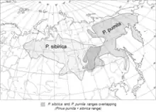This article incorporates text from this source, which is in the public domain. - ↑ "GENETIC EVIDENCE OF NATURAL HYBRIDIZATION BETWEEN SIBERIAN STONE PINE, PINUS SIBIRICA DU TOUR, AND DWARF SIBERlAN PINE, P. PUMILA (PALL.) REGEL" (PDF). 4 September 1998.