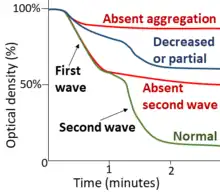 On for example optical densitometry, a first and second wave of platelet aggregation is seen, in this case for an ADP-initiated aggregation.