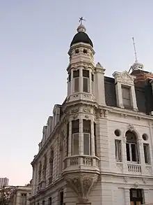 It is an important reference of late eclectic historicism, with accentuated neo-baroque elements that give it a great aesthetic and architectural quality. Its rich exterior ornamentation is made up of projections, porticoes, railings and elements that emulate fusta and capitals. Its upper cornice has tympanums and a mansard roof. It also has a central dome, and on the corner that faces the intersection of the streets, an attached volume topped by a showy keep .[6]