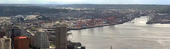 Elliott Bay and the East Waterway of the Duwamish, seen from the Space Needle, 2014. Harbor Island at right. Container port facilities in the right half of the photo are all on Port of Seattle land.