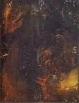 The reverse of Albrecht's panel contains a rendition of the allied Dürer and Holper families' coats of arms,[37] which are shown beneath a winged Moor wearing a red dress.[38] The Dürer family are represented by a crest showing an open door, a pun on the word Dürer (Thürer meaning 'doormaker'). Albrecht the Elder was born in the Hungarian village of Ajtó. Ajtos is Hungarian for "door"—when his parents moved to Germany their name changed from Tür to Düre.[39][upper-alpha 5][20] The Holper crest features a stag, but its significance is lost.[41] The back of Barbara's panel contains imagery of a dragon in a lightning storm set against a rocky landscape or cliff.[7]