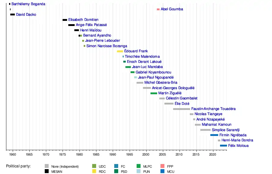 Félix MolouaHenri-Marie DondraFirmin NgrébadaSimplice SarandjiMahamat KamounAndré NzapayekéNicolas TiangayeFaustin-Archange TouadéraÉlie DotéCélestin GaombaletMartin ZiguéléAnicet-Georges DologuéléMichel Gbezera-BriaJean-Paul NgoupandéGabriel KoyambounouJean-Luc MandabaEnoch Derant LakouéTimothée MalendomaÉdouard FrankSimon Narcisse BozangaJean-Pierre LebouderBernard AyandhoHenri MaïdouAnge-Félix PatasséElisabeth DomitienDavid DackoAbel GoumbaBarthélemy Boganda
