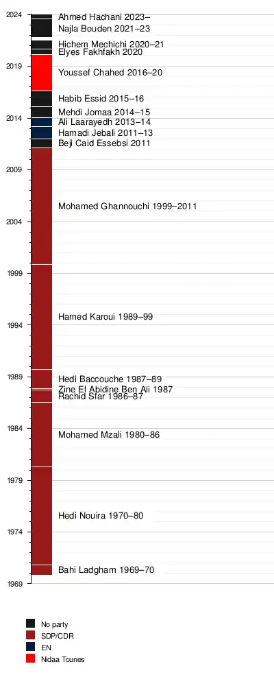 The prime minister of Tunisia (Arabic: رئيس حكومة تونس, romanized: ra’īs ḥukūmat Tūnis) is the head of the executive branch of the government of Tunisia. The prime minister directs the executive branch along with the president and, together with the prime minister's cabinet, is accountable to the Assembly of the Representatives of the People, to the prime minister's political party and, ultimately, to the electorate for the policies and actions of the executive and the legislature.
