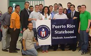 The PRSSA then began an inscription campaign for the November 2008 Puerto Rican general elections during the summer of 2008.[13] On August 11, 2008, the PRSSA held an Absentee Vote Inscription Party in Shannan's Pub of Guaynabo, Puerto Rico, which featured PRSSA founders and NPP candidates Luis Fortuño and Pedro Pierluisi.[14] The Association then held an exhibition during the 2008 New Progressive Party Convention in the Condado Plaza Hotel of San Juan, Puerto Rico. This was followed by a PRSSA-led student registration drive in 22 colleges and universities throughout Puerto Rico.[15] The Puerto Rico State Elections Commission reported in September 2008 that over 200,000 students registered to vote for the first time, a result of the efforts by the PRSSA and other pro-statehood organizations.