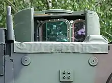 In addition to the usual smoke-grenade launchers with 8 shots, there is a multishot 40 mm launcher at the back of the vehicle for close-in defence. The main back door can be opened halfway and enables two of the passengers to scout and shoot from moderate protection.