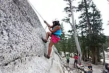 Some good beginner routes are on the easier low angled face, and several harder routes are around the far side of the dome; there is an overhanging face.[5]